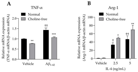 The mRNA expression levels of TNF-α and Arg-1 in SIM-A9 cells stimulated with Aβ1-42 or IL-4 were analyzed. SIM-A9 cells stimulated with 10 μM Aβ1-42 for 4 h showed a significant increase in TNF-α mRNA levels under normal conditions (Figure 5A). These enhancing effects were markedly suppressed by choline deficiency (Figure 5A). Choline deficiency also significantly suppressed basal TNF-α mRNA expression. Stimulation of SIM-A9 cells with IL-4 significantly increased Arg-1 mRNA in a concentration-dependent manner under normal conditions (Figure 5B). These potentiating effects were markedly enhanced by choline deficiency (Figure 5B).