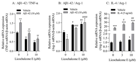 Effect of Lico E on TNF-α and Arg-1 mRNA expression in SIM-A9 cells stimulated with Aβ1-42 and IL-4. (A) Effect of Lico E on TNF mRNA expression in SIM-A9 cells stimulated with Aβ1-42. (B) Effect of Lico E on Arg-1 mRNA expression in SIM-A9 cells stimulated with Aβ1-42. Cells were treated with various concentrations (0, 3 and 10 μM) of Lico E for 30 min, followed by stimulation with 10 μM Aβ1-42 for 4 h. Values are the mean ± SD (n = 3). * p < 0.05 and *** p < 0.0005 compared with vehicle control. Statistical analysis of the data was performed using Šídák’s multiple comparisons test. † p < 0.05 and †† p < 0.0001 compared with vehicle control (0 µM of Lico E). Statistical analysis of the data was performed using Dunnett’s multiple comparisons test. # p < 0.005 and ## p < 0.0005, ### p = 0.0005 and #### p < 0.0001 compared with vehicle control (0 μM of Lico E). Statistical analysis of the data was performed using Dunnett’s multiple comparison test. (C) Effect of Lico E on Arg-1 mRNA expression in SIM-A9 cells stimulated with IL-4. Cells were treated with various concentrations (0, 3 and 10 μM) of Lico E for 30 min, followed by stimulation with 5 ng/mL IL-4 for 4 h. Values are the mean ± SD (n = 3). *** p < 0.0005 compared with vehicle control. Statistical analysis of the data was performed using Šídák’s multiple comparisons test. † p < 0.01 compared with vehicle control (0 µM of Lico E). Statistical analysis of the data was performed using Dunnett’s multiple comparisons test. # p < 0.005 and ## p < 0.0005 compared with vehicle control (0 μM of Lico E). Statistical analysis of the data was performed using Dunnett’s multiple comparisons test.