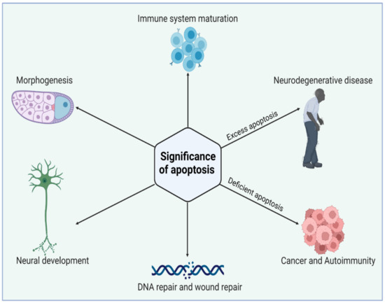 Biological significance of apoptosis in maintaining tissue homeostasis during cell life. Apoptosis has an essential role in the elimination of unwanted cells during early development. Excess or deficient apoptosis leads to several diseased conditions. Figure is created with BioRender.com (https://app.biorender.com, access on 22 November 2022).