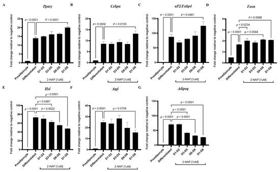 Figure 3. Chronic 2-naphthol treatment regulates adipogenic, lipogenic, and lipolytic gene expression in 3T3-L1 adipocytes. Relative mRNA expression of genes encoding for adipogenic transcription factors (A) Pparγ and (B) Cebpα; adipocyte-specific marker (C) ap2/Fabp4, lipogenic and lipolytic markers (D) Fasn(E) Hsl and (F) Atgl; and the adipokine (G) Adipoq was measured in preadipocytes and differentiated 3T3-L1 adipocytes treated with 1 µM 2-NAP at different differentiation stages as indicated. Upon experimental termination, mRNA was extracted and relative gene expression was then determined by RT-PCR (n = 4). The values shown represent the mean ± SEM. A p-value of p < 0.05 indicates statistical significance between two groups.