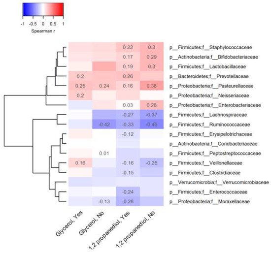 Spearman correlation was used to determine the correlation between gut microbiota at the family level, glycerol and 1,2-PD concentrations. The Spearman ranked order analysis was performed using the Hmisc R package (https://hbiostat.org/R/Hmisc/ Accessed on 1 September 2021), followed by visualization using the gplots R package (https://github.com/talgalili/gplots Accessed 1 September 2021). The scatterplot to explore the relationship between taxa of particular interest and measured levels of fecal glycerol and 1,2-PD was made using the ggpubr R package (https://cran.r-project.org/web/packages/ggpubr/index.html Accessed 1 September 2021). Analyses were conducted using STATA release 14 (StataCorp) and R (version 4.1.1)