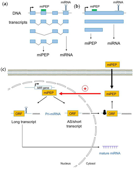 To conclude this part, the studies described above show that while positive feedback regulation has been found in all plant miRNA genes studied so far, diverse miPEP effects have been reported in different animal model systems (Figure 1b), indicating that miPEP-dependent positive feedback regulation of miRNA genes is not a general mechanism that can be extended to all organisms.