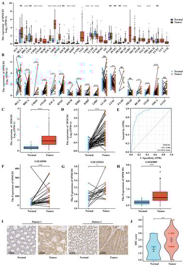 mRNA and protein expression levels of SPOCD1 in pan-cancer and colorectal cancer (CRC) versus normal samples. (A,B) SPOCD1 mRNA expression was upregulated in pan-cancer tissues compared with normal tissues based on TCGA. (C,D) SPOCD1 mRNA expression was upregulated in CRC compared with normal tissues based on TCGA. (E) ROC analysis of SPOCD1 in the diagnosis of CRC. (F–H) SPOCD1 mRNA expression was upregulated in CRC compared with normal tissues based on GEO. (I,J) IHC staining showing SPOCD1 protein expression was upregulated in CRC samples compared with normal tissues. (ns represents no significance, * p < 0.05, ** p < 0.01, *** p < 0.001).