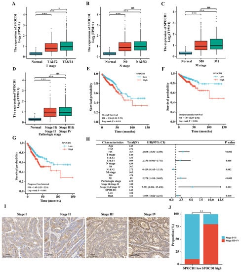 Associations between SPOCD1 expression and clinicopathologic characteristics and its prognostic significance in CRC based on TCGA database. SPOCD1 expression was significantly associated with T stage (A) but not with N stage (B), M stage (C), and pathological stage (D). (E–G) The Kaplan-Meier curves show that CRC patients with a higher expression of SPOCD1 had a shorter overall survival time, disease-specific survival time, and progress-free interval time. (H) Multivariate Cox analyses of factors affecting the overall survival of CRC patients in the TCGA database. (I) immunohistochemistry (IHC) staining showing SPOCD1 protein expression in CRC samples of the different pathological stages. (J) Stacked histogram shows the proportion of CRC at different stages in the high and low SPOCD1 expression groups. (ns represents no significance, * p < 0.05, ** p < 0.01, *** p < 0.001).