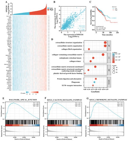 Co-expression gene analysis and subsequent GO and KEGG enrichment analysis of SPOCD1. (A) Heatmap illustrating the top 50 genes positively correlated with SPOCD1 in CRC. Red represents high expression, and blue represents low expression. (B) Correlation analysis of SPOCD1 and SCL11A1. (C) The Kaplan-Meier plots for overall survival for CRC patients according to the difference SLC11A1 expressions. (D) GO and KEGG pathway analysis of SPOCD1 co-expressed gene with a correlation coefficient > 0.6 in CRC. (E–G) GSEA enrichment plots showed positive correlations of SPOCD1 co-expression genes with the apical junction, calcium, and chemokine signaling pathway (*** p < 0.001).
