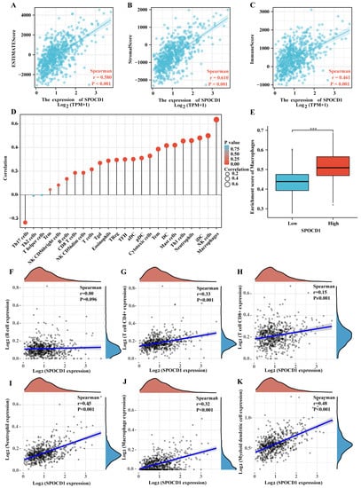 The correlation of SPOCD1 expression with tumor microenvironment and immune infiltration level in CRC. (A–C) The correlation between SPOCD1 expression and the ESTIMATE, stromal, and immune scores based on the ESTIMATE algorithm. (D) The lollipop plot shows the correlation of SPOCD1 expression with immune cell infiltration conducted by ssGSEA. (E) Enrichment score of macrophages according to the difference SPOCD1 expressions. (F–K) The correlation of SPOCD1 expression with immune cell infiltration in CRC acquired from the TIMER online tool. (*** p < 0.001).