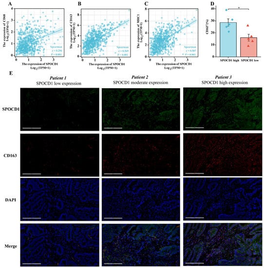 Correlation between SPOCD1 expression level and macrophage markers in CRC. (A–C) Correlation between SPOCD1 expression and macrophage markers (CD68, CD163, and MRC1). (D) CD163 is upregulated in SPOCD1 high-expression group. (E) Expression of SPOCD1 and M2 macrophage marker CD163 in CRC tissues (* p < 0.05).