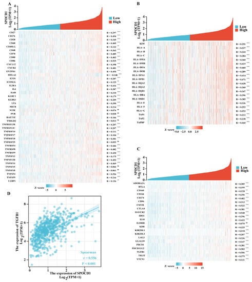 Correlation between SPOCD1 expression level and immunological microenvironment biomarkers in CRC. (A) Correlation between SPOCD1 and immunostimulatory gene expression in CRC. (B) Correlation between SPOCD1 and MHC molecule expression in CRC. (C) Correlation between SPOCD1 and immunoinhibitory gene expression in CRC. (D) Correlation between SPOCD1 expression and TGFB1 in CRC (ns represents no significance, ** p < 0.01, *** p < 0.001).