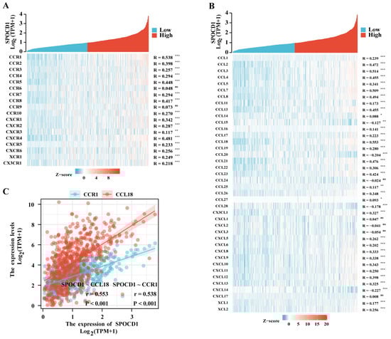Correlation analysis between SPOCD1 expression and chemokines and chemokine receptors in CRC. (A) Heatmap analysis of the correlation between SPOCD1 and chemokine receptors in tumors. (B) Heatmap analysis of the correlation between SPOCD1 and chemokines in tumors. (C) Correlation between SPOCD1 expression and chemokines CCL18, chemokine receptors CCR1 in CRC (ns represents no significance, * p < 0.05, ** p < 0.01, *** p < 0.001).