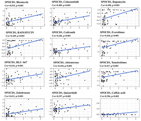 We obtained drug sensitivity and gene expression data from CellMiner, eliminated FDA-unapproved medicines, and determined the association between SPOCD1 expression and drug sensitivity in R utilizing the cor. test and correlation function. In this study, we focused on the 12 leading medications linked to SPOCD1. Several pharmaceuticals were shown to have an association with SPOCD1 expression, including Bleomycin, Cabozantinib, Rapamycin, Cediranib, Everolimus, BLU-667, Abiraterone, Temsirolimus, Zoledronate, Quizartinib, and Caffeic acid (Figure 8). Tumor cells were more sensitive to these medicines when the SPOCD1 level was upregulated. These findings point to SPOCD1 expression as a potential indicator of drug sensitivity.