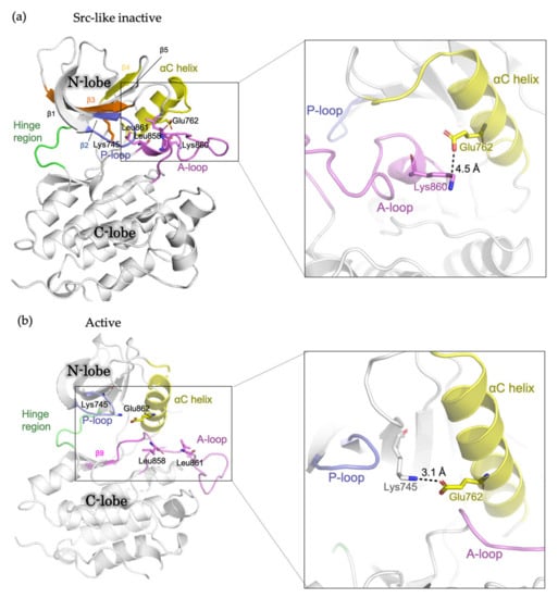 Figure 1. Schematic representation showing the structure of the EGFR kinase domain. (a) Src-like inactive conformation (PDB ID: 2GS7) and (b) active conformation (PDB ID: 2ITP) with important residues and structural features labelled.