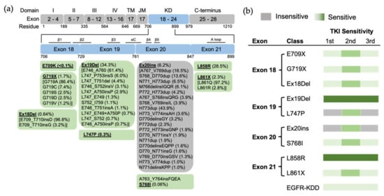 Figure 3. The position of EGFR mutations and sensitivity to EGFR TKIs based on exon-grouped classification. (a) Exons 18–21 in the tyrosine kinase region where the relevant mutations are located are expanded, and a detailed list of EGFR mutations in these exons is shown in the boxes below. TM, transmembrane; JM, juxtamembrane; KD, kinase domain. (b) The sensitivity to EGFR TKIs based on exon-grouped classification. Gray, insensitive to EGFR TKIs. Green, sensitive to EGFR TKIs in which the light-to-strong color represents weak-to-strong sensitivity.
