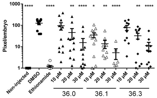 - Habjan, E.; Ho, V.Q.T.; Gallant, J.; van Stempvoort, G.; Jim, K.K.; Kuijl, C.; Geerke, D.P.; Bitter, W.; Speer, A. An Anti-Tuberculosis Compound Screen Using a Zebrafish Infection Model Identifies an Aspartyl-TRNA Synthetase Inhibitor. Dis. Model. Mech. 2021, 14, dmm049145. [Google Scholar] [CrossRef] [PubMed]