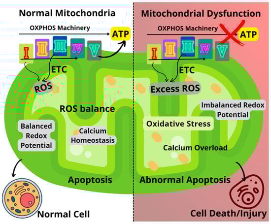 Comparison between healthy and dysfunctional mitochondria, highlighting the key mechanisms of mitochondrial dysfunction. ETC: Electron transport chain; ROS: Reactive oxygen species.