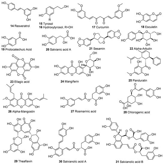 AMPK is inhibited by ATP, and the AMP/ATP ratio gives a sensitive indication of the metabolic state of a cell [194]. AMPK, when activated by mitochondrial ROS, promotes mitophagy, which may lead to a reduction in mitochondrial number, a decrease in ATP levels, and a subsequent increase in AMP/ATP ratio [194,195,196]. The PTEN-induced kinase 1 (PINK1) pathway-Parkin pathway also plays a crucial role in the mitophagy of weak mitochondria and maintenance of mitochondrial homeostasis [196,197,198,199]. Several studies have linked the accumulation of weak mitochondria in cells due to decreased mitophagy to deficient levels of PINK1 and Parkin [196,197]. Compounds quercetin (1), resveratrol (14), and ligustilide (49) were reported to modulate PINK1/Parkin.