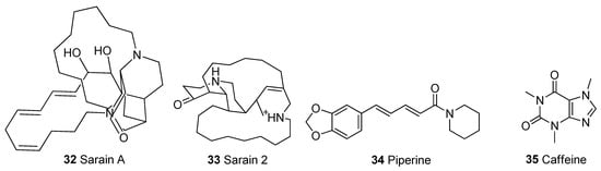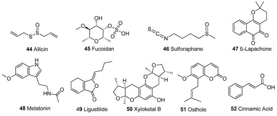 Other structural classes. Organosulphur compounds: 44-46; benzochromone: 47; Amine: 48; Lactone: 49; Cyclic polyketide: 50; Coumarin derivative: 51, Organic acid: 52.