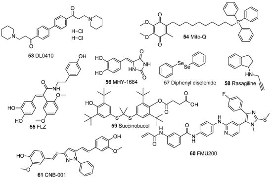 The most outstanding compound of all 61 discussed is perhaps rasagiline (58), a well-known monoamine oxidase inhibitor. Rasagiline is a novel propargylamine and an approved treatment for PD either as a monotherapy or in combination with other treatments such as levodopa [206,207]. Rasagiline was reported to attenuate mitochondrial dysfunction by reducing oxidative stress, preventing MMP collapse, suppressing apoptosis by lowering the release of cytochrome C, and improving ATP synthesis [158]. This is quite interesting because there are well-established links between PD and mitochondrial dysfunction [208], suggesting that rasagiline has multifaceted modes of action as far as the treatment of PD is concerned. The compound was also highly potent, showing excellent activity at a concentration range of 10 μM to 10 nM [158]. Rasagiline prevented ΔΨm collapse [158] and caused a three-fold increase in ATP level at 10 μM and 1 μM as well as a two-fold increase at 100 nM and 10 nM [159]. The compound also completely suppressed cell death at 10 μM and 1 μM by reducing cytochrome c [158,159]. Rasagiline is also currently trialed for treatment in AD, with results from the proof of concept of the phase II trials recently published [209].