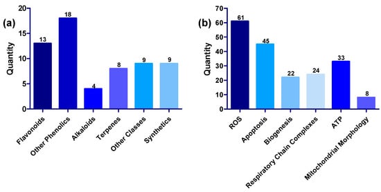 (a) Distribution of compounds across various structural classes of flavonoids, phenolic compounds, alkaloids, terpenes, other structural classes, and synthetic compounds. (b) Distribution of compounds across various targets, including ROS, apoptosis, biogenesis, respiratory chain complexes, ATP, and mitochondrial morphology.