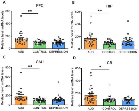 Hevin mRNA and protein expression levels were measured in four human brain areas (PFC, HIP, CAU and CB) from 75 subjects. Individuals were divided according to their antemortem psychiatric history: AUD (n = 25), depression (n = 25) and control (n = 25) groups. Interestingly, in all the studied brain areas an increase in hevin mRNA was detected in the AUD group compared to the controls (PFC: 59% increase, p = 0.0028; HIP: 72% increase, p = 0.0058; CAU: 92% increase, p = 0.0028 and CB: 70% increase, p = 0.0344). No significant differences were detected between the depression and control groups (Figure 1A–D).