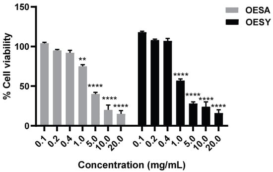 Figure 2. Cytotoxic effects of OESA and OESY on HeLa cell line. The inhibitory effects of OESA and OESY on cell growth were determined using a CCK8 assay. Cells were exposed to serial dilutions of OESA and OESY (0.1; 0.2; 0.4; 1; 5; 10; and 20 mg/mL) for 72 h and further incubated with CCK8 tetrazolium salt solution in the dark for 4 h. The absorbance was measured at 460 nm and the % of cell viability was calculated with respect to the untreated cells. Results are expressed as mean ± standard deviation (n = 3). ** p < 0.01, **** p < 0.0001.