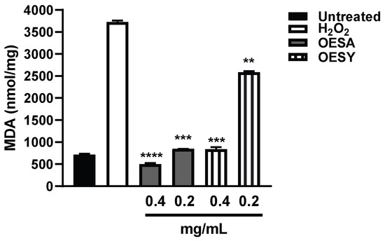 Figure 3. MDA levels in untreated HeLa cells and those treated with OESA and OESY. HeLa cells were cultured simultaneously and exposed to 0.4 and 0.2 mg/mL of OESA or OESY and H2O2 (0.2 mM) for 30 min. The MDA levels were evaluated by determining the thiobarbituric acid-reactive substances. The data are expressed in nmol/mg of protein (** p < 0.01, *** p< 0.001, **** p < 0.0001). Results are expressed as mean ± standard deviation (n = 3).