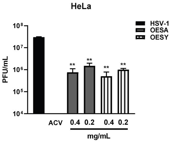 Figure 4. Evaluation of viral titer in HeLa cells following OESA and OESY treatment. HeLa cells (4 × 105 cells/wells) and the virus were pre-treated with OESA and OESY at 0.4 and 0.2 mg/mL for 1 h at 37 °C. Then, the pre-treated virus was used to infect pre-treated cells. The infection was carried out at 10 MOI at 37 °C, and 1 h later, the viral inoculum was removed and replaced with growth medium in the presence of both compounds at 0.4 and 0.2 mg/mL. Acyclovir (50 µM) was used as a positive control. Samples collected 24 h p.i were frozen and thawed three times and 100 µL of each dilution of the viral suspension was used to infect the VERO monolayers. The multiwell plates were incubated for 1h at 37 °C. Then, the viral inoculum was removed and replaced with a culture medium containing 0.8% methylcellulose. After 72 h, plaques were visualized and counted on the microscope after staining with a crystal violet solution. Statistical analyses were performed in triplicate using a one-way ANOVA analysis assay, and ** p < 0.01 vs. HSV-1 +DMSO indicates significant change.