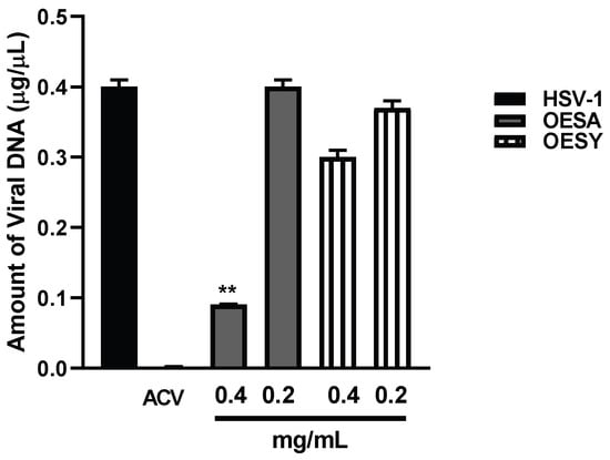 Figure 5. Absolute quantification of viral DNA. HeLa cells and the virus were pre-treated with OESA and OESY at 0.4 and 0.2 mg/mL for 1 h at 37 °C. Then, the pre-treated virus was used to infect pre-treated cells. The infection was carried out at 10 MOI at 37 °C, and 1 h later, the viral inoculum was removed and replaced with growth medium in the presence of both compounds at 0.4 and 0.2 mg/mL. Acyclovir (50 µM) was used as a positive control. The viral DNA was extracted 24 h post-HSV-1 infection as described in the Materials and Methods. Viral DNA amounts were determined via absolute Real-Time PCR using a TaqMan probe. The results are expressed as concentrations in µg of DNA/µL. Statistical analyses were performed in triplicate using a one-way ANOVA analysis assay, and ** p < 0.01 vs. HSV-1 + DMSO indicates significant change.