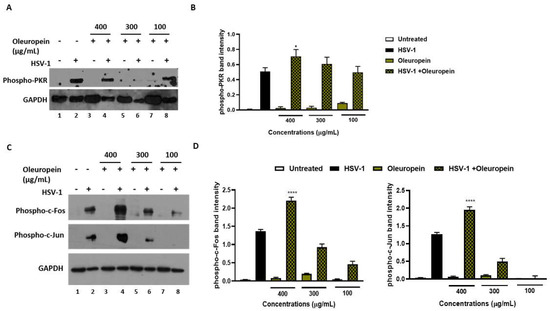 Figure 8. Activation of innate antiviral response mediated by phospho-PKR, phospho-c-Jun, and phospho-c-Fos in infected HeLa cells following oleuropein treatment. HeLa cells were infected at 10 MOI with HSV-1 and were untreated or treated with different concentrations of oleuropein (400 µg/mL, 300 µg/mL, and 100 µg/mL). (AC) Phospho-PKR, phospho-c-Jun, and phospho-c-Fos protein expression was evaluated via Western blotting. Quantitation of the respective phospho-PKR, phospho-c-Fos and phospho-c-Jun protein bands is shown in (B,D). Data represent the means of 3 independent experiments ± SD. Statistical evaluation via one-way ANOVA: * p < 0.1, **** p  <  0.001.
