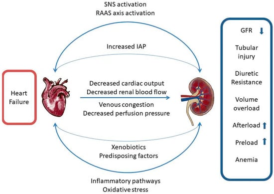 Initially, it leads to the activation of various hemodynamic and neurohormonal compensatory mechanisms [3,4]. Reduced cardiac output and prerenal hypoperfusion stimulates the sympathetic nervous system (SNS), the renin–angiotensin–aldosterone system (RAAS) and non-osmotic release of vasopressin increasing preload as a consequence of fluid and salt retention [5,6,7]. In addition to the vasoconstrictive response mediated by the SNS, as a result of stimulation of the juxtaglomerular complex in the nephron, the release of renin is increased. This leads to further activation of the RAAS, with a synergistic effect of angiotensin and aldosterone on systemic vascular resistance and sodium reabsorption [8]. In a recent study on 211 patients with acute heart failure, RAAS overactivity was linked to worse renal function, diuretic and natriuretic response and poor outcomes [9]. Increased vasopressin levels result in fluid reabsorption and excretion of more concentrated urine. Moreover, inappropriate stimulation of the RAAS axis results in the formation of reactive oxygen species (ROS), caused by activation of nicotinamide adenine dinucleotide phosphate by angiotensin II. In the setting of developing kidney injury, the homeostasis between nitric oxide (NO) and ROS is shifted toward oxidative stress [10]. Physiologically, NO represents a significant role in paracrine and autocrine signaling as a vasodilatative, natriuretic and vascular endothelial growth factor, as well as an inhibitor of smooth muscle cell proliferation, atherogenesis and platelet aggregation [11]. Disproportionate ROS production accelerates atherosclerosis, which is the most common factor leading to the development of heart failure (HF). A combination of these factors contributes to heart and renal tubular cell fibrosis in the long term.