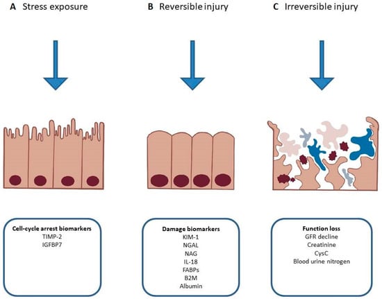Phases of acute kidney injury and relevant biomarkers. (A) Release of cell-cycle arrest biomarkers in response to exposure to non-damaging stimuli. (B) Potentially reversible injury resulting in changed metabolism or expression of damage biomarkers. (C) Persistent injury resulting in necrosis, apoptosis and kidney dysfunction. TIMP-2—tissue inhibitor of metalloproteinase 2, IGFBP7—insulin-like growth factor-binding protein 7, KIM-1—kidney injury molecule 1, NGAL—neutrophil gelatinase-associated lipocalin, NAG—N-acetyl-ß-d-glucosaminidase, IL-18—interleukin-18, FABPs—fatty acid-binding proteins, B2M—beta-2 microglobulin, GFR—glomerular filtration rate, CysC—cystatin C.