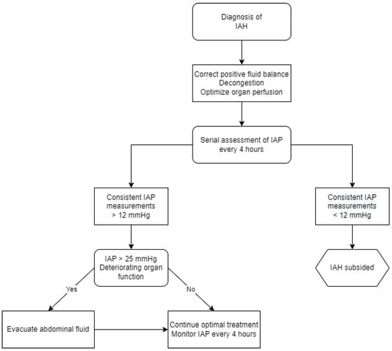 Management algorithm for intra-abdominal hypertension. IAP—intra-abdominal pressure, IAH—intra-abdominal hypertension.