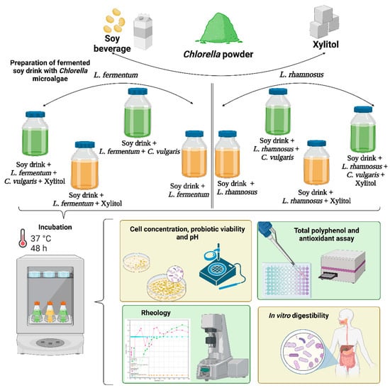 For the preparation of soy drinks with microalgae, 1.5% (w/v) inactivated dried organic C. vulgaris powder was added to 50 mL of soy beverages; the concentration of the microalgae was based on the manufacturer’s daily recommendation for humans. Additionally, to sweeten the samples, 1.5% (w/v) xylitol was incorporated. The schematic representation is presented in Figure 1. Eight samples were prepared, four for each probiotic strain (L. fermentum, L. rhamnosus), according to the previous method [39]. The first sample was the control (probiotic strain and soy beverage). In the second container 1.5% C. vulgaris powder, probiotic strain, and soy beverage were added. The third sample, xylitol at a concentration of 1.5%, probiotic strain, and soy beverage were incorporated. In the fourth container, 1.5% xylitol, 1.5% C. vulgaris powder, probiotic strain, and soy beverage were added. The filling of the containers was done under sterile conditions.
