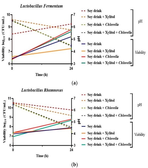 Cell viability and pH profile of the fermentation with (a) L. fermentum and (b) L. rhamnosus. Values for LAB viable cell growth and pH are displayed as mean values, log10 CFU/mL, n = 3, GraphPad Prism Version 8.0.1; soy drink (1); soy drink + xylitol (1.5%); soy drink + C. vulgaris (1.5%), soy drink + xylitol+ C. vulgaris (1.5%); CFU/mL (colony-forming units/milliliter of the sample).
