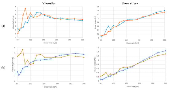 The present manuscript analyzed the flow behavior of soy drink fermented with/ L. fermentum or L. rhamnosus, and with/without C. vulgaris enrichment and xylitol addition. The alterations in the apparent viscosity and shear stress at a temperature of 20 °C, and with constantly increasing shear rate (ẏ) from 5 to 300 1/s, are presented in Figure 3 and Figure 4a–c. As can be observed the viscosity of the samples differ in case of both LAB and also with the enrichment of the samples. Significant differences (p < 0.05) could be only observed between the fermented soy drink with L. fermentum and L. rhamnosus.