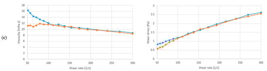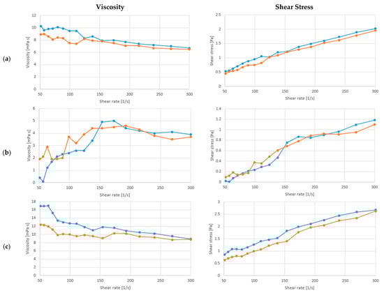 Relationship between viscosity/shear stress and shear rate at 20 °C of the samples with (a) Soy drink + L. fermentum, (b) Soy drink + L. fermentum + Xylitol, (c) Soy drink + L. fermentum + C. vulgaris + Xylitol (experiments effectuated in duplicate red and blue line).