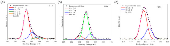C1s spectra (Figure 3a) are made of four components. The first component, fixed at 284.7 eV, is assigned to aromatic and aliphatic carbons; the second at around 286.0 eV to C-N; the third at about 287.6 eV is due to C-O carbons; the last at about 288.5 eV to C=O carbons [28].