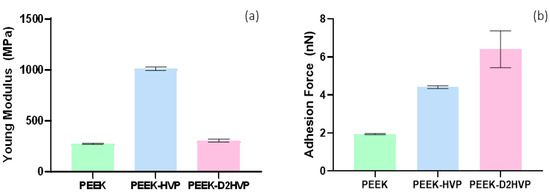 As shown in Figure 4a, both functionalized PEEK samples presented an increased stiffness denoted by a higher value of the surface Young’s modulus. The effect is particularly evident in the case of PEEK-HVP, where an almost quadruplicate value with respect to the control has been found. The increase of surface rigidity with the functionalization of the PEEK substrate may be explained in terms of the expected stronger interchain interactions and, thus, with the consequent increase in the value of Young’s modulus for all the analyzed surfaces. In particular, the effect is enhanced for PEEK functionalized with HVP, as far as the shorter peptide sequence can interlock more easily within the polymer chains.