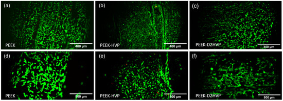 Live and Dead staining of HOB cultured for 48 h on non-functionalized and functionalized PEEK at 48 h. A large number of viable (green) cells e were observed, with very few dead (red) cells seen in all images (a–f). A greater number of rounded cells were observed on PEEK-HVP (b,e).