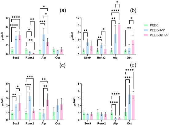 qRT-PCR assay. Gene expression of Sox9, Runx2, Alp, and Oct, was evaluated on differently functionalized PEEK samples at 1 day (a), 7 days (b), 14 days (c), and 21 days (d) from HOB seeding. * p-value < 0.05, ** p-value < 0.01, *** p-value < 0.001, and **** p-value < 0.0001.
