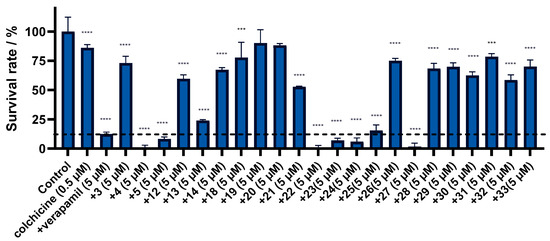 Figure 4. The reversal study of nine quinazolinamine compounds on P-gp-mediated multidrug resistant cell line KB-C2. The statistical significances between the treatment groups and the control group were indicated as follows: ****, p < 0.0001, two-way ANOVA, indicating the statistical significances between the control group and the treatment groups, two-way ANOVA.