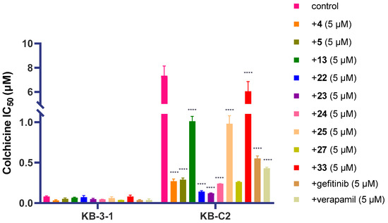 Inhibitory activities of the quinazolinamines derivatives 35, 1214, and 1833 on P-gp were studied to investigate the selectivity of these compounds. The quinazolinamine derivatives exhibited low cytotoxicity at the concentration of 5 μM toward the parental KB-3-1 (Figure S3) and P-gp-overexperssing KB-C2 (Figure S4) cell lines. These compounds did not decrease the viability of the KB-3-1 and KB-C2 cells by more than 20%. Hence, the reversal assays were conducted on the drug-resistant KB-C2 cell line with the quinazolinamine derivatives at the concentration of 5 μM. The results indicated that compounds 45, 13, 2225, and 27 exhibited potent P-gp inhibition (Figure 3). When these quinazolinamines were combined with the P-gp substrate, colchicine (0.5 μM), the survival rate of KB-C2 cells dramatically decreased, compared to the colchicine alone. Therefore, these eight compounds were further investigated, and it was found that compounds 45, 2224, 27 exhibited higher potency than verapamil and gefitinib (Figure 4). The results indicated that in combination with compounds 45, 2224, 27, the IC50 values of colchicine on KB-C2 cells were decreased dramatically from 7.34 μM to lower than 0.30 μM, while verapamil and gefitinib decreased the IC50 value of colchicine to 0.43 and 0.55 μM, respectively. In addition, azide derivative 33 did not show potent inhibition on the P-gp with IC50 value of 6.05 μM for colchicine after the combination.