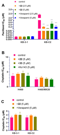 Figure 5. The reversal study of 22 and 33 in combination with anticancer drugs. (A) The reversal study of 22 with paclitaxel on P-gp-mediated multidrug-resistant cell line KB-C2. (B) The reversal study of 22 and 33 with cisplatin on BCRP-mediated multidrug-resistant cell line H460/MX20. (C) The reversal study of 22 with cisplatin on P-gp-mediated multidrug-resistant cell line KB-C2. The statistical significances between the treatment groups and the control group were indicated as follows: ****, p < 0.0001, two-way ANOVA, indicating the statistical significances between the control group and the treatment groups, two-way ANOVA.