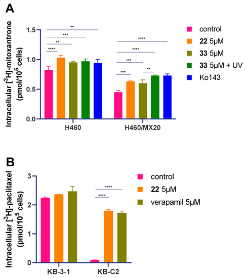 Figure 6. The effect of 22 and 33 on the accumulation of mitoxantrone on H460/MX20 (A) or paclitaxel on KB-C2 cells (B). Ko143 and verapamil were used as positive controls. The statistical significances between the treatment groups and the control group were indicated as follows: **, p < 0.01, ***, p < 0.001; ****, p < 0.0001, two-way ANOVA, indicating the statistical significances between the control group and the treatment groups, two-way ANOVA.