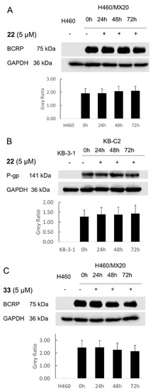 Figure 7. The effect of 22 and 33 on BCRP and P-gp expression level in drug-resistant cell lines. (A) The effect of 22 on BCRP expression in H460/MX20 cells. (B) The effect of 22 on P-gp expression in KB-C2 cells. (C) The effect of 33 on BCRP expression in H460/MX20 cells.