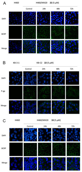 The immunofluorescence assays were conducted to determine the effects of 22 and 33 on the localization of BCRP or P-gp proteins. BCRP protein is expressed on the membranes of drug-resistant cells H460/MX20 and the P-gp protein is expressed on the membranes of KB-C2 cells in the control groups (Figure 8A,B). With the incubation of 22 (5 μM) for 24, 48, and 72 h, the fluorescence on the membranes of H460/MX20 decreased gradually. With the treatment of 22 (5 μM) for 24 and 48 h, the fluorescence on the membranes of KB-C2 cells did not decrease significantly, while the fluorescence decreased slightly at 72 h. Since 22 does not change the expression level of BCRP and P-gp protein based on the Western blot analysis, it was hypothesized that the intracellular localization of the ABC transporters on both H460/MX20 and KB-C2 cells were altered by 22. The alteration of the ABC transporters’ localization can result in the loss of the efflux function of ABC-transporters in MDR cells. Thus, the anticancer drugs can be accumulated in the cells, and effectively killing them. Interestingly, 33 did not change the intracellular localization of BCRP on H460/MX20 cells (Figure 8C). The reversal effect of 33 on BCRP can be due to other mechanisms instead of the alteration of the BCRP localization.
