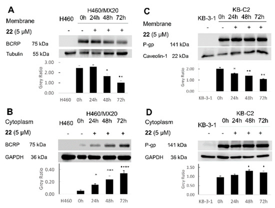 To further investigate whether 22 affects the localization of BCRP and P-gp, the proteins were extracted from the membrane and cytoplasm of the cells, respectively. It was found that 22 decreased the expression level of BCRP protein on the membrane of H460/MX20 cells. On the other hand, the BCRP protein expression level in the cytoplasm was increased by target Compound 22 (Figure 9A,B). Compound 22 showed a similar effect on the P-gp protein expression of the KB-C2 cells (Figure 9C,D) that the expression level of the P-gp protein on the membrane slightly decreased and the cytoplasmic P-gp slightly increased through the quantifications with Image J. These results revealed that 22 can translocate BCRP or P-gp protein from the membrane to the cytoplasm.