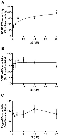 Figure 10. The effect of 22 and 33 on orthovanadate (Vi)-sensitive ATPase activity of BCRP and P-gp. (A) The effect of 22 on Vi-sensitive BCRP ATPase activity. (B) The effect of 33 on Vi-sensitive BCRP ATPase activity. (C) The effect of 22 on Vi-sensitive P-gp ATPase activity.