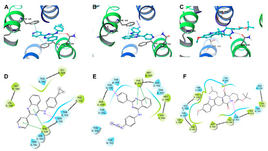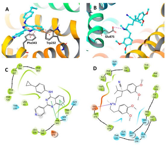 The Glide docking scores of 22, 33, and Ko143 binding with BCRP (PDB 6FFC) are −11.123, −10.403 and −12.017 kcal/mol, respectively (Figure 11). The quinazoline ring and the pyridine ring of 22 interacted with the Phe439 of the BCRP model through π-π interactions. The amino group of 22 formed a hydrogen bond with the carbonyl group in the side chain of Asn436 (Figure 11A,D). The quinazoline ring of 33 interacted with the Phe439 of the BCRP model through π-π interactions (Figure 11B,E). The nitrogen in the pyridine ring of 33 formed a hydrogen bond with the amino group in the side chain of Asn436. The amino group of Ko143 interacted with the carbonyl group in the side chain of Asn436 through a hydrogen bond. The carbonyl group of Ko143 formed a hydrogen bond with the hydroxyl group of Thr542. (Figure 11C,F). Compounds 22 and 33 were stabilized into a pocket formed by residues Phe432, Thr435, Thr542, Val546, and Met549 of BCRP. The Glide docking scores of 22 and verapamil binding with P-gp (PDB 7A6E) [23] were −8.288 and −7.774 kcal/mol, respectively (Figure 12). The quinazoline ring of 22 interacted with Phe343 and Trp232 of the P-gp model through π-π interactions. The tertiary amine of verapamil can become a cation in cancers due to the acidic tumor microenvironment [29] and form a salt bridge with the side chain of Glu875 in P-gp.