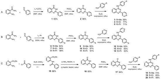 The quinazolinamines 35 were synthesized via cyclic condensation reaction of amide and aldehyde, chlorination of quinazolinone, and then nucleophilic aromatic substitution (Scheme 1A). 2-Substituted quinazolinone 1 was synthesized [8] by a cyclic condensation reaction of anthranilamide with 4-pyridinecarboxaldehyde. Subsequently, the quinazolinone derivative was refluxed with phosphorus oxychloride to obtain 4-chloroquinazolinamine derivative 2. Nucleophilic aromatic substitution of the 4-chloroquinazolinamine derivative with para-substituted anilines was carried out under microwave irradiation to obtain methyl, ethyl, and propyl quinazolinamines 35 in 56–77% yields, respectively. Compounds 68 were synthesized via iodine catalysis and air oxidation in 83–98% yields, respectively. Chlorination of quinazolinones 68 led to compounds 911. Nucleophilic aromatic substitution of compounds 911 led to target quinazoliamine derivatives 1214.