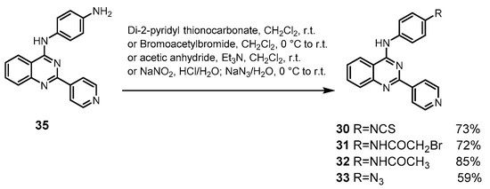 Target compounds 2129 (Scheme 2) were synthesized from Compound 2 in a similar fashion as Compounds 35. A nucleophilic aromatic substitution of the 4-chloroquinazolinamine derivatives with various substituted anilines was carried out to obtain the desired quinazolinamines 2129. Amino derivative 28 was used to synthesize 3033 (Scheme 3) by reacting with di(2-pyridyl) thionocarbonate, bromoacetyl bromide, acetic anhydride, sodium nitrite and sodium azide, respectively.